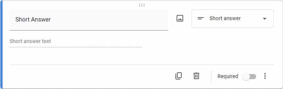 Returning to the add questions button, you can choose from various question types depending on your needs and the intention of your form. You can also establish if the form will be accepted without each question being filled out. These question types are followed by examples of how they look in Google Forms: